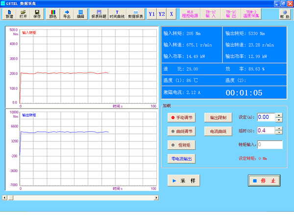 傳動機(jī)械測量系統(tǒng)采用磁粉制動器對減速機(jī)(擺線針輪減速機(jī)、蝸輪減速機(jī)、行星齒輪減速機(jī)等)加載,采用相位差式轉(zhuǎn)矩轉(zhuǎn)速傳感器對變速箱(減速機(jī))進(jìn)行扭矩測量、轉(zhuǎn)速測量、功率測量、機(jī)械效率測量、速比計算;采用數(shù)字溫度傳感器進(jìn)行溫度測量。根據(jù)用戶要求設(shè)計減速機(jī)測試軟件,輸出減速機(jī)測試報表。該系統(tǒng)可以進(jìn)行空載試驗、滿載試驗、效率試驗、溫升試驗。