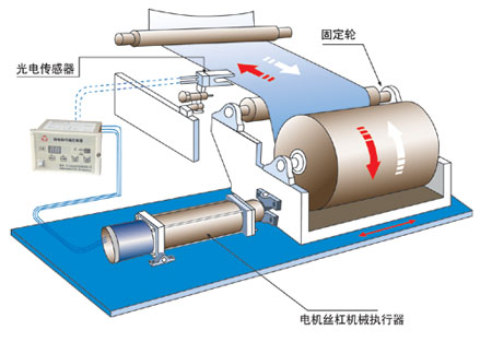 光電傳感器或氣敏探頭固定,而且接近于放料車臺之位置,經電機絲杠或液壓缸驅動修正,使所卷之材料相對傳感器或探頭不偏不倚的行走。